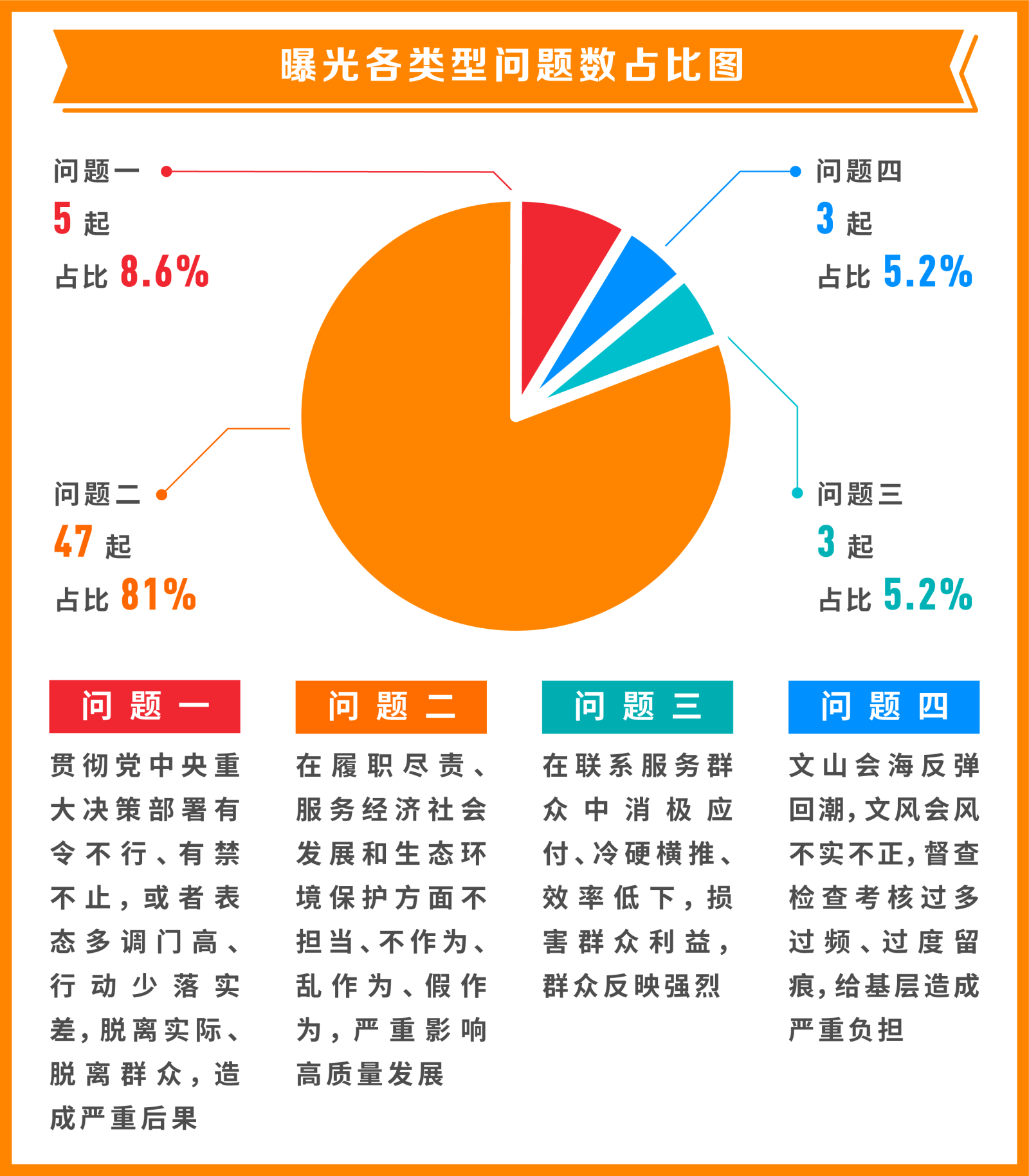 從具體問(wèn)題類型看,“貫徹黨中央重大決策部署有令不行、有禁不止,或者表態(tài)多調(diào)門(mén)高、行動(dòng)少落實(shí)差,脫離實(shí)際、脫離群眾,造成嚴(yán)重后果”方面問(wèn)題5起,占比8.6%;“在履職盡責(zé)、服務(wù)經(jīng)濟(jì)社會(huì)發(fā)展和生態(tài)環(huán)境保護(hù)方面不擔(dān)當(dāng)、不作為、亂作為、假作為,嚴(yán)重影響高質(zhì)量發(fā)展”方面問(wèn)題47起,占比81%;“在聯(lián)系服務(wù)群眾中消極應(yīng)付、冷硬橫推、效率低下,損害群眾利益,群眾反映強(qiáng)烈”方面問(wèn)題3起,占比5.2%;“文山會(huì)海反彈回潮,文風(fēng)會(huì)風(fēng)不實(shí)不正,督查檢查考核過(guò)多過(guò)頻、過(guò)度留痕,給基層造成嚴(yán)重負(fù)擔(dān)”方面問(wèn)題3起,占比5.2%。